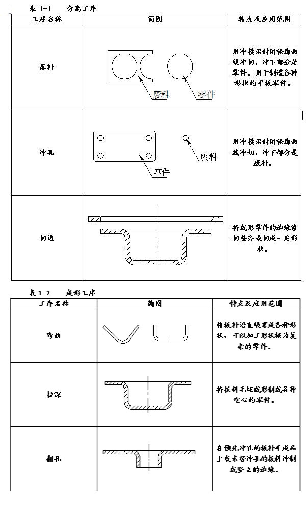 冷沖壓工藝按其變形性質(zhì)可分為分離工序和成形工序兩大類。分離工序又可分為落料、沖孔和切邊等,如表1-1所示。成形工序可分為彎曲、拉深、翻孔、翻邊、脹形、擴口、縮口和旋壓等,如表1-2所示。根據(jù)產(chǎn)品零件的形狀、尺寸精度和其他技術(shù)要求,可分別采用各種工序?qū)Π辶厦鬟M行加工,以獲得滿意的零件。